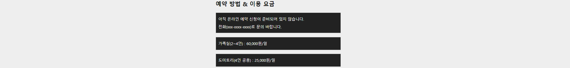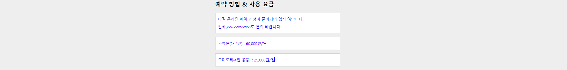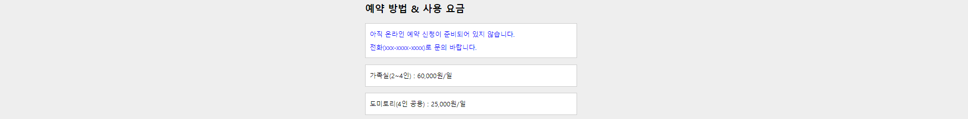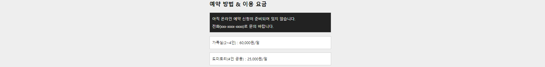<p>아직 온라인 예약 신청이 준비되어 있지 않습니다. <br>전화(xxx-xxxx-xxxx)로 문의 바랍니다.</p>