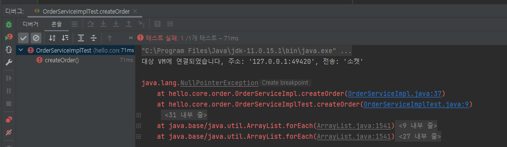 Ex) OrderServiceImpl의 생성자에 Autowired를 붙이기 전