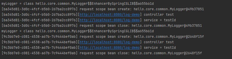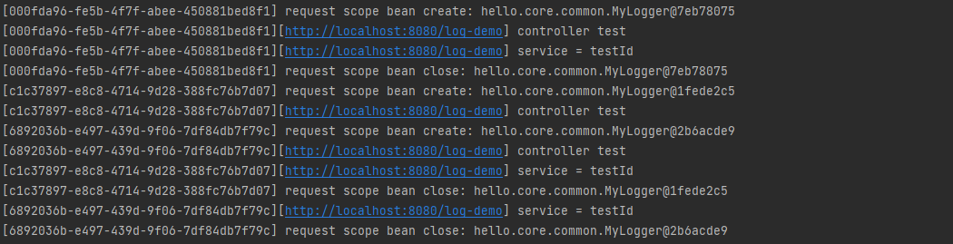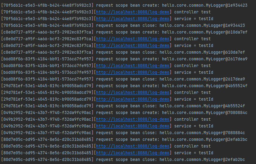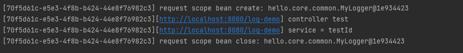 - request scope 빈을 만들고 소멸되는 것이 로그에 남는다.