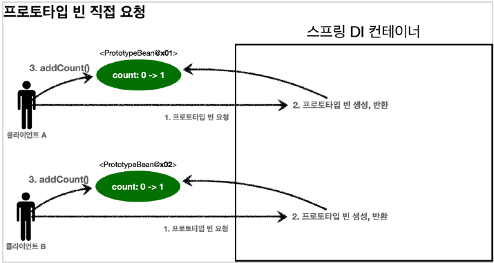 - 그래서 프로토타입 빈을 조회한 클라이언트가 관리해야한다. 종료 메서드호출도 클라이언트가 직접 해야한다.