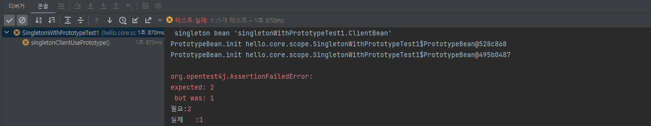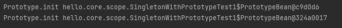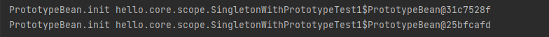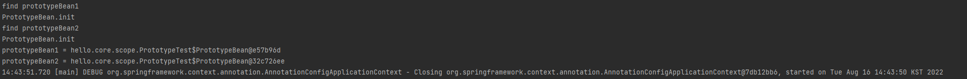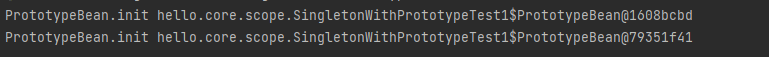 - 프로토타입 빈을 2번 조회했으므로 완전히 다른 스프링 빈이 생성되고 초기화도 2번 된 것을 알 수 있다.
