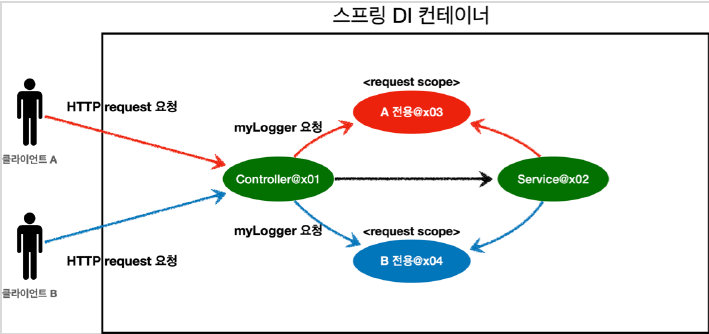 - @Scope(value = "request') 를 사용해서 request 스코프로 지정한다. 이제 HTTP요청당 빈이 하나씩 생성되고 요청이 끝나는 시점에 소멸된다.