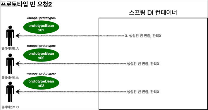 - 스프링 컨테이너는 프로토타입 빈을 생성하고 의존 관계 주입, 초기화까지만 처리한다는 것이다. 클라이언트가 빈을 반환하고 이후, 스프링 컨테이너는 생성된 프로토타입 빈을 관리하지 않는다. 프로토타입 빈을 관리할 책임은 프로토타입 빈을 받은 클라이언트에 있다. 그래서 종료 메서드가 호출되지 않는다.