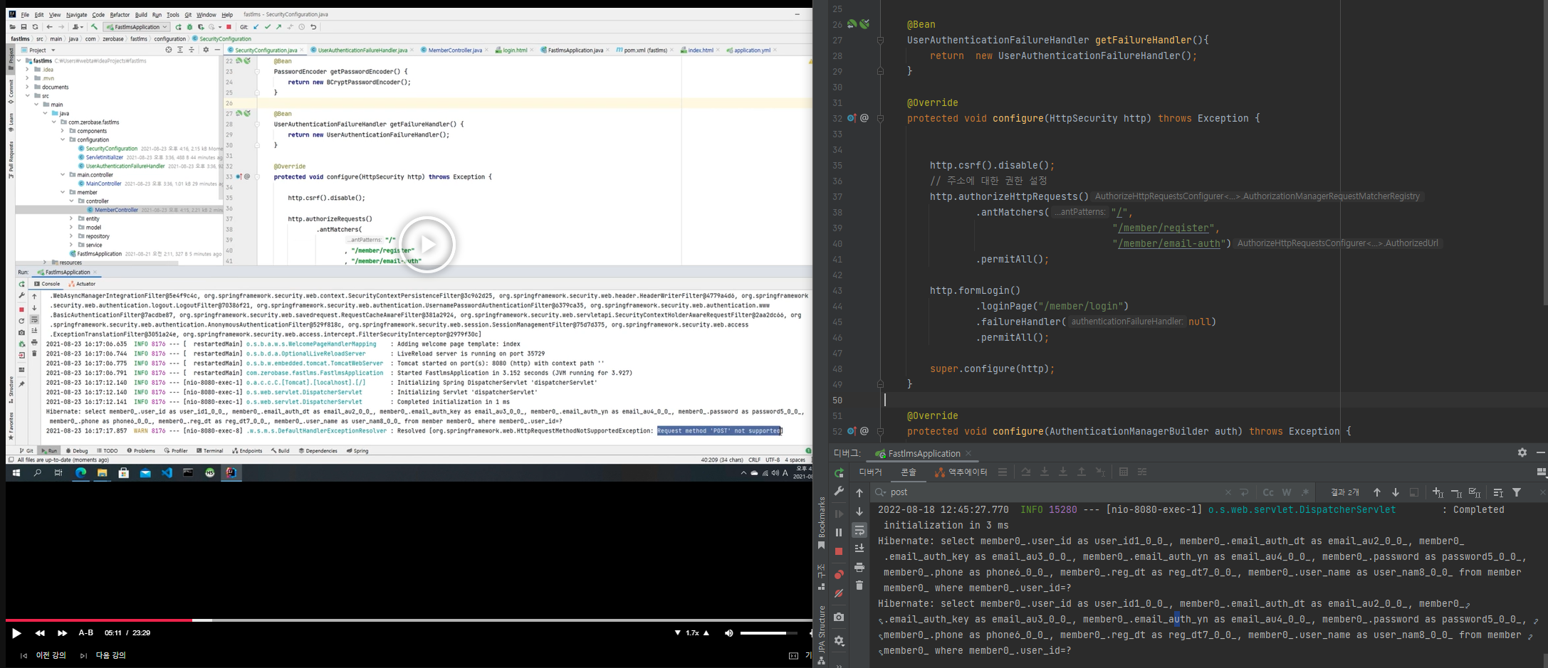 - 오류: 로그인 정보를 입력하면 강사님처럼 request method 'POST' not supported가 나와야되는데 안 나온다.