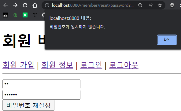 - 비밀번호를 다르게 입력하고 비밀번호 재설정 버튼을 누르면?