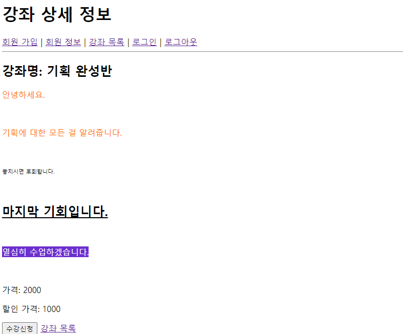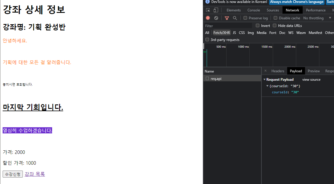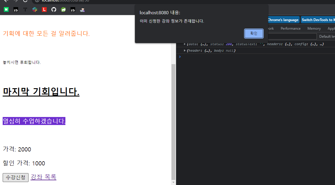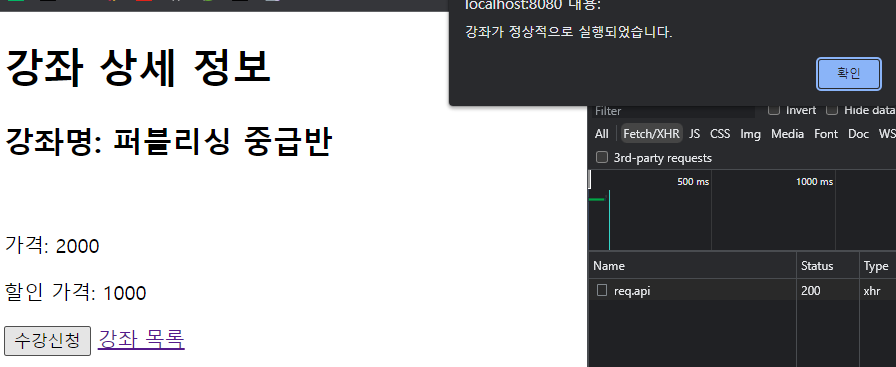 Note) 실행 결과 - 새로운 강좌를 신청한 경우, 아래의 창이 뜨고 난 다음 메인 페이지 이동