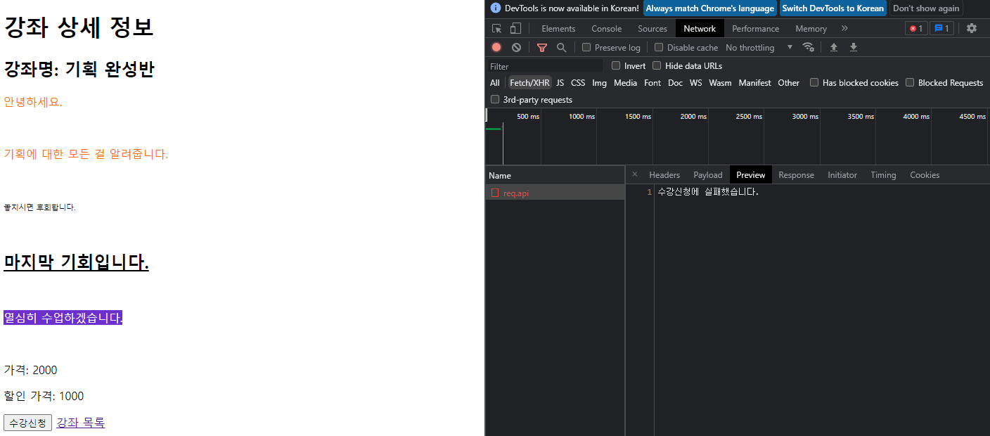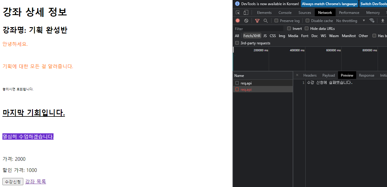 - 아까와는 다른게 수강 신청의 결과를 boolean이 아닌 문자열 형태로 반환할 것이다.