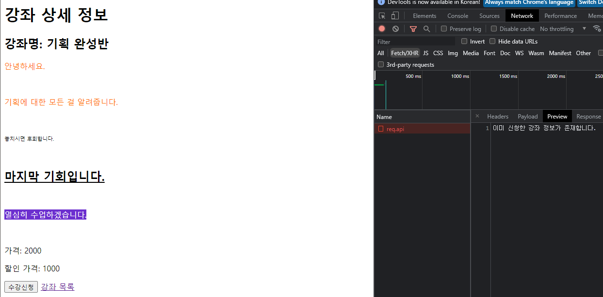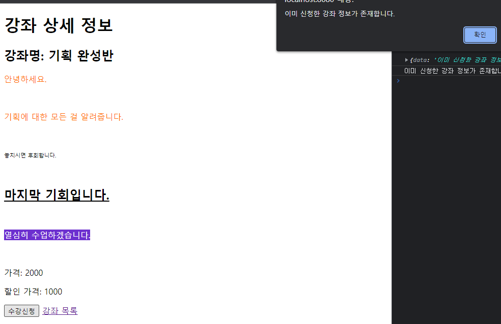 -> 중복하여 수강신청했을 때 콘솔 화면