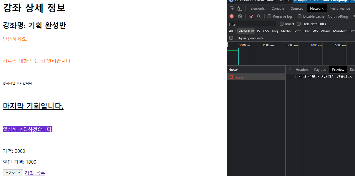 Note) 실행 결과 - 잘못된 courseId 번호에 대해 수강신청하는 경우