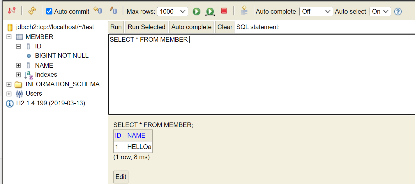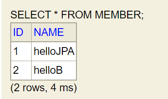 - 위 매인 클래스를 실행한 다음에 H2를 들어가서 멤버 클래스를 조회하면 아래와 같이 데이터베이스에 데이터가 들어간 걸 볼 수 있다.