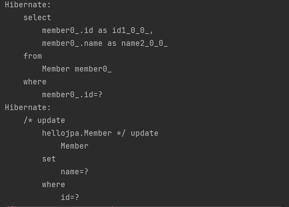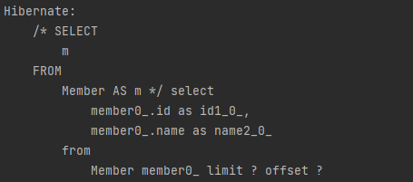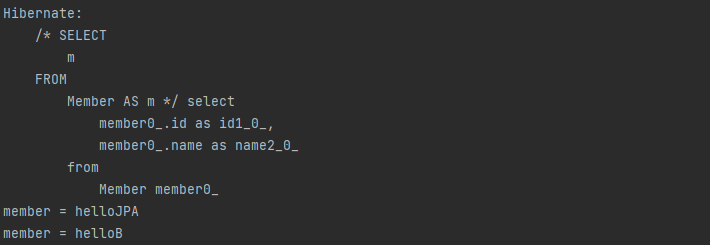 - 주석 안에는 createQuery() 안에 작성한대로 JPQL 쿼리가 그대로 들어가있다. - 멤버 엔티티를 선택한 것이다.