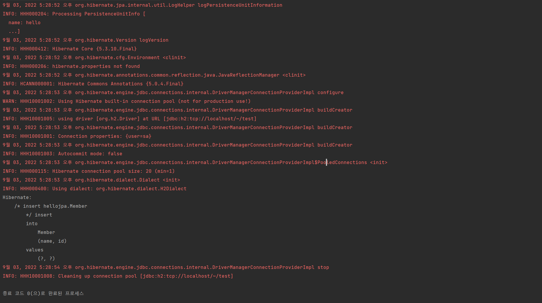 9월 03, 2022 1:20:05 오후 org.hibernate.engine.jdbc.connections.internal.DriverManagerConnectionProviderImpl configure