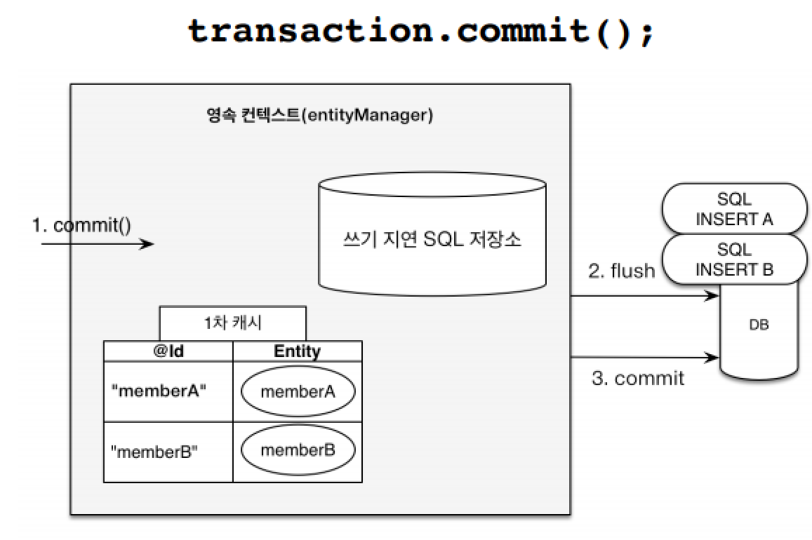 - => 쓰기 지연 SQL 저장소의 쿼리를 데이터베이스에 전송한다. ( ex) 등록, 수정, 삭제 쿼리)