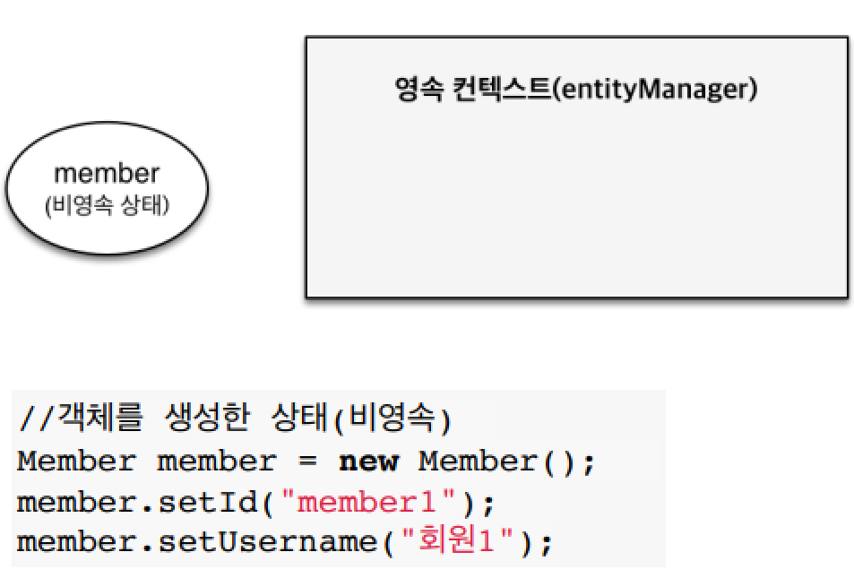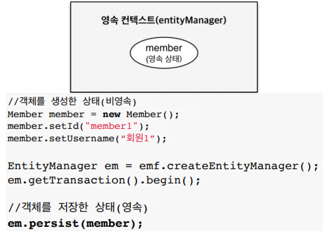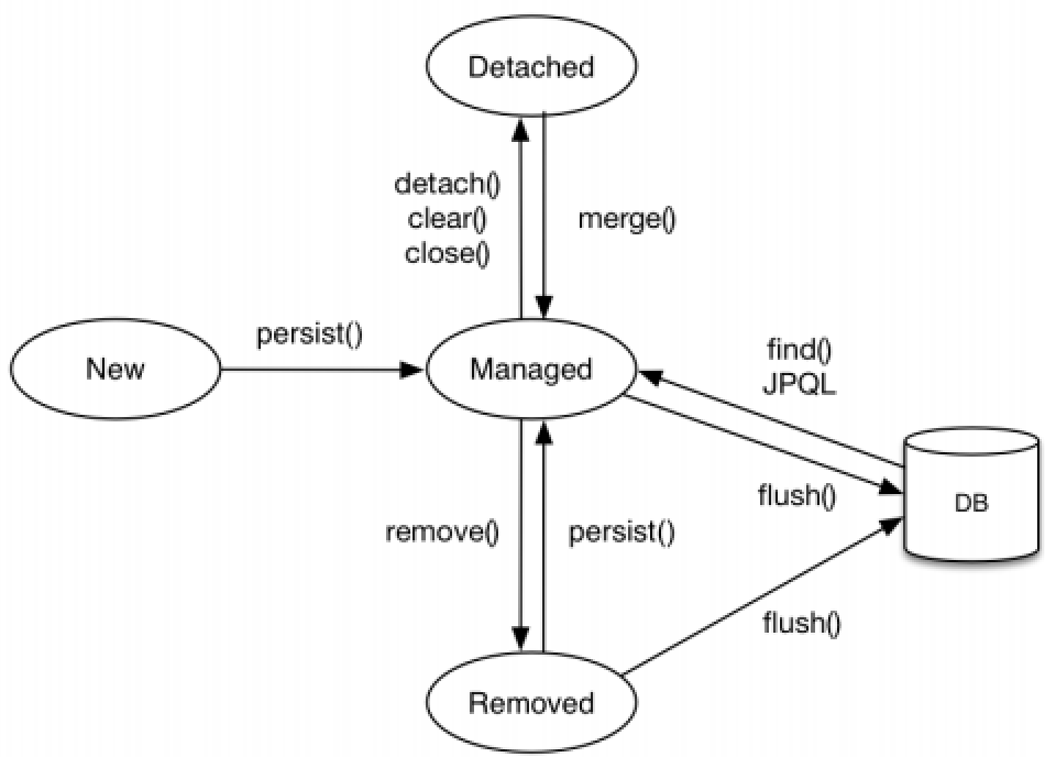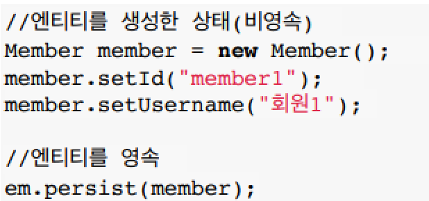 - 영속(managed): 영속성 컨텍스트에 관리되는 상태 (em.persist() 이후 또는 em.find같은 메서드로 조회했을 때 없는 경우 => 영속 상태가 된다.)