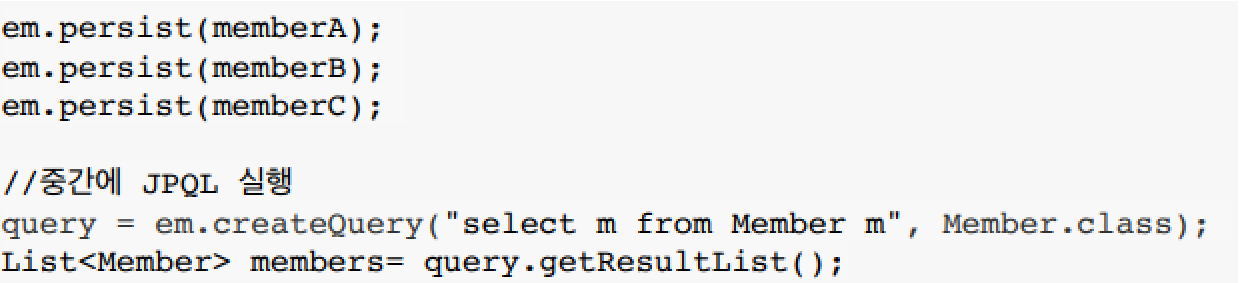 - 예를 들어, 위 코드에 대해 JPQL에서 테이블이 memberA, memberB, memberC와 관련 없는 테이블인 경우, 쿼리를 실행할 때 플러시할 필요 없는 경우에 쓰인다.