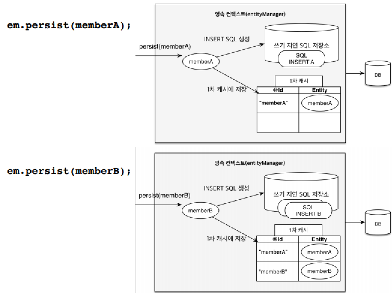 - 엔티티 매니저에 persist()로 멤버를 저장하면 영속 컨텍스트에 객체가 들어가면서 영속 상태가 된다. (1차 캐시에 저장한다.)