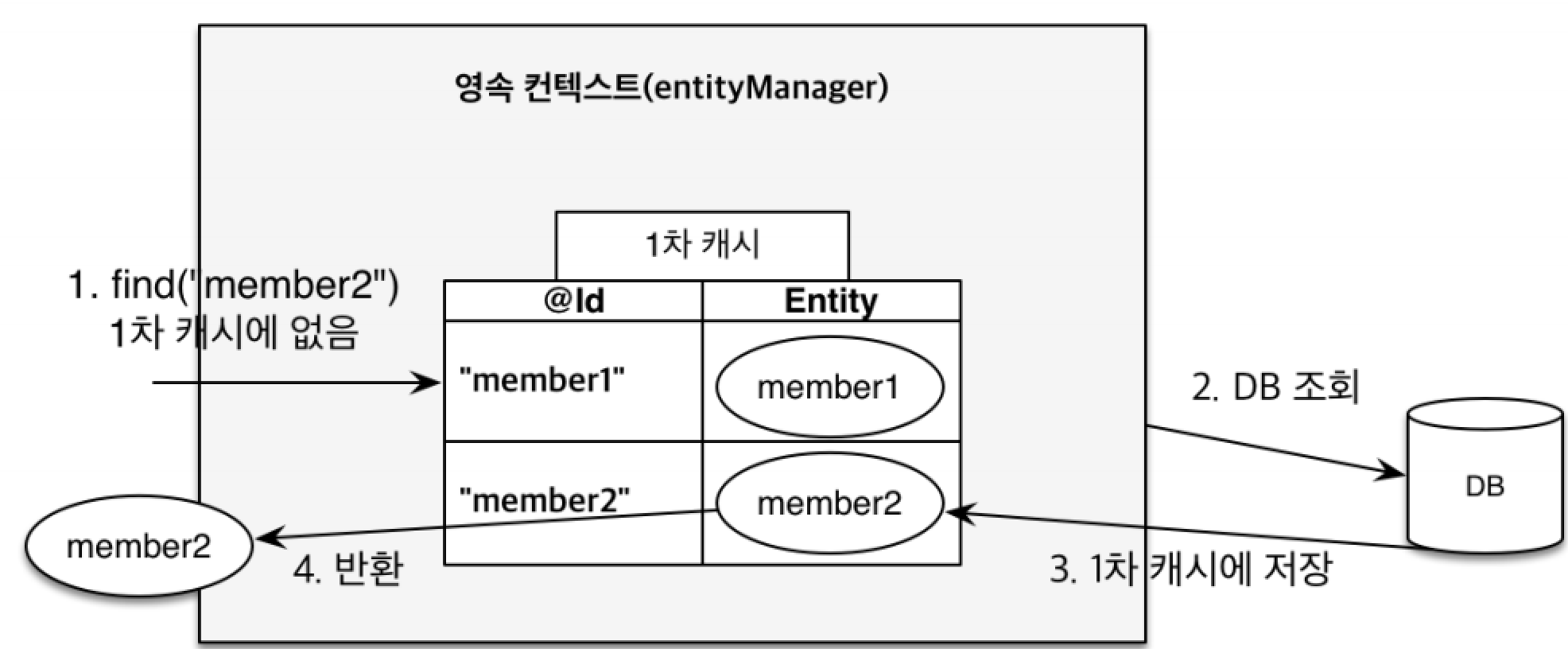- ex) find("member1")을 조회하는 경우, JPA는 DB가 아니라 먼저 1차 캐시에서 값을 찾는다.
