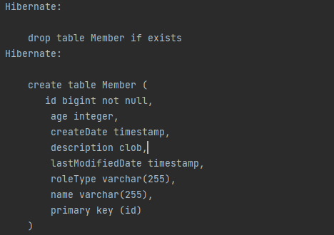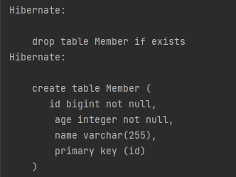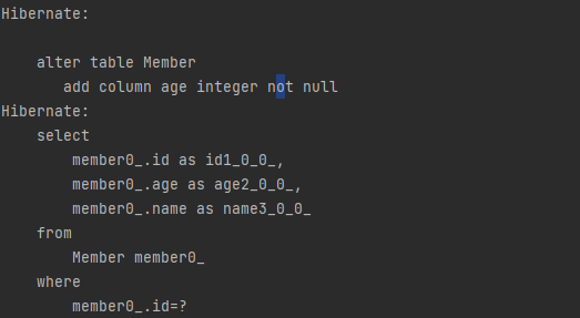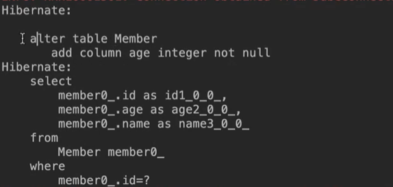 - 원인: 다시 create를 했다가 Member클래스에 age 컬럼을 추가하고 update, 다시 매인 클래스를 실행하니까 정상 실행됐다.
