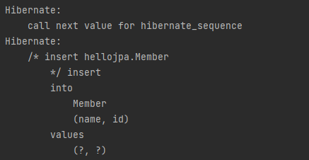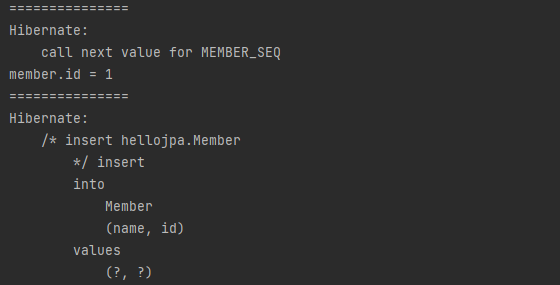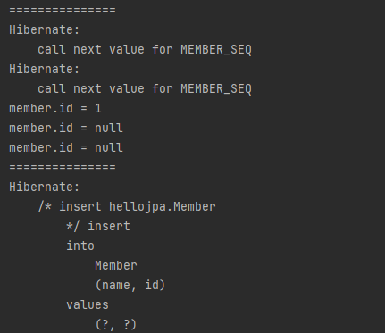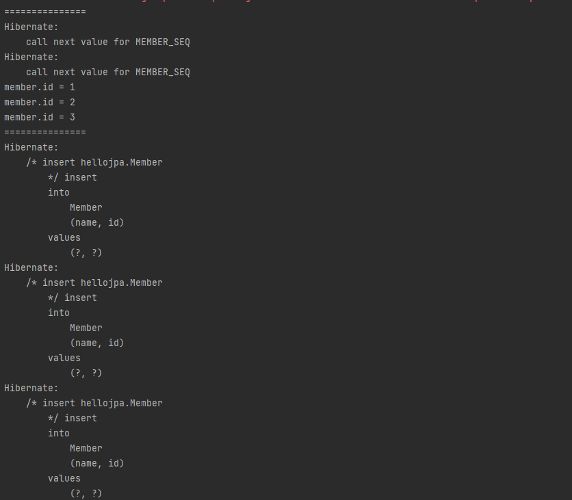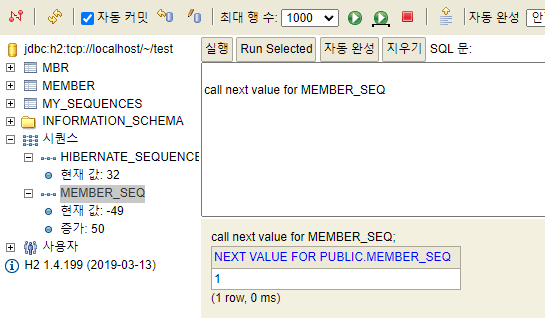 - call next value for MEMBER_SEQ: 데이터베이스에 다음 값을 달라고 요청한다.