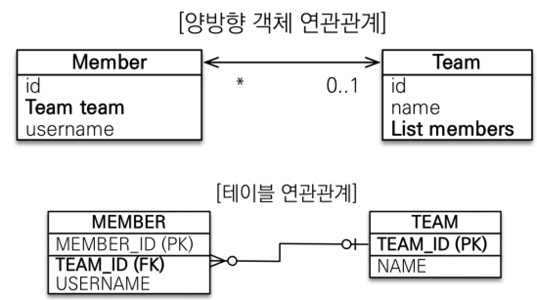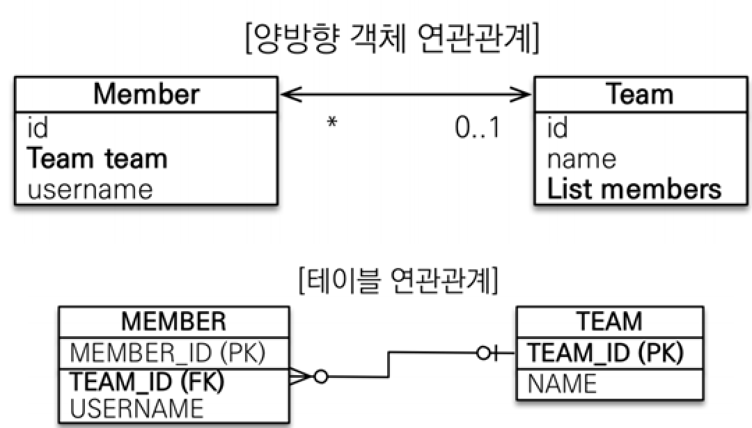 - 테이블은 외래키 하나로 양방향을 모두 이어준다. 따라서, 테이블에는 방향 개념이 없다.