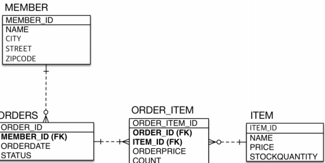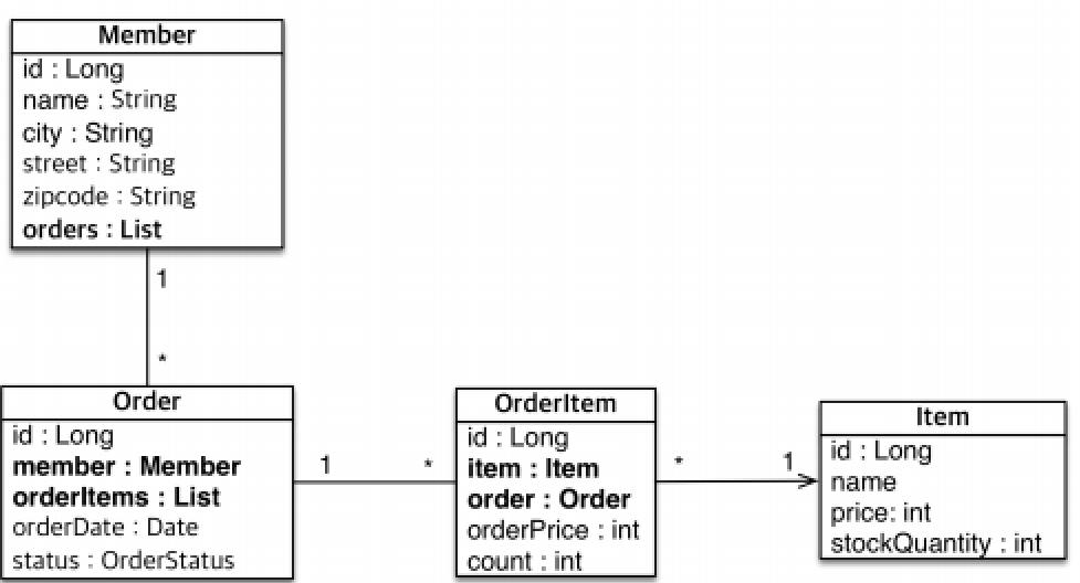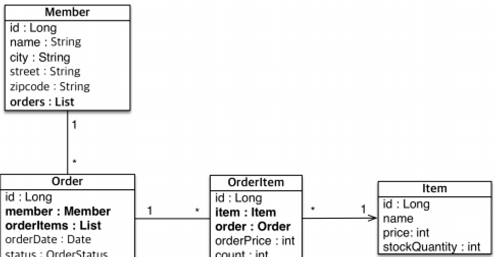 - OrderItem 클래스가 "다"에 해당한다. (하나의 Order에 여러 개의 OrderItem이 있기 때문)