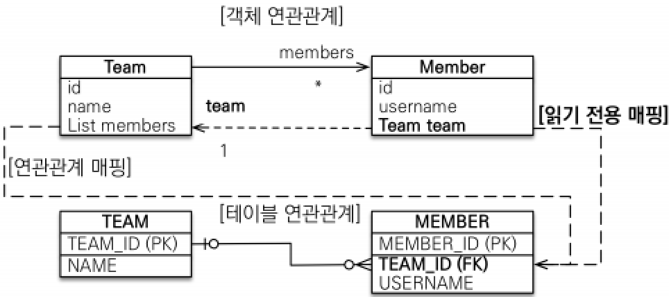 - 기존의 일대다 단방향 방식에서 멤버 클래스가 팀 클래스를 참조 가능하며 MEMBER 테이블 읽기 전용으로 매핑된다.