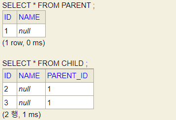 - 이전 예제에서는 em.remove()가 아니라 findParent.getChildList().remove(0); 실행해서 하나의 자식만 삭제했다.