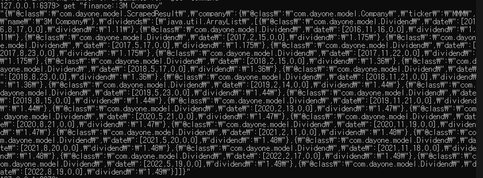 - http://localhost:8080/finance/dividend/Apple%20Inc. 를 실행하면 이전에 DB에서 데이터를 가져올 때보다 시간이 더 빨라진다. 캐시에서 데이터를 가져오기 때문이다.