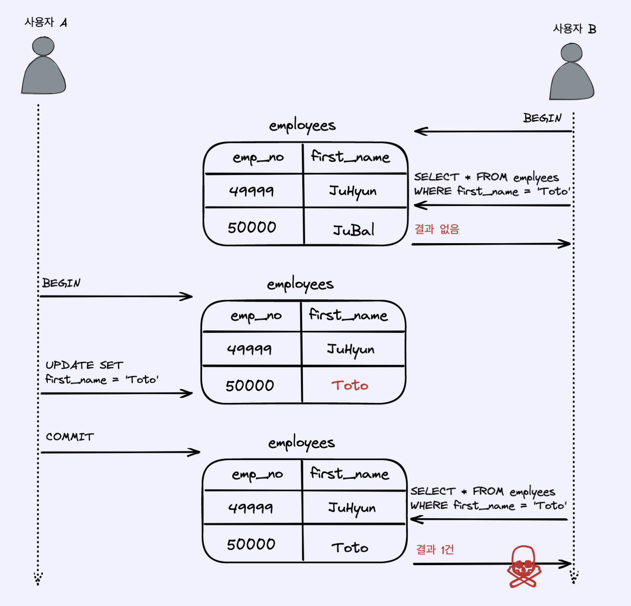 - B가 변경된 내용을 커밋하기도 전에 B는 emp_no = 500000인 사원을 검색하고 있다.