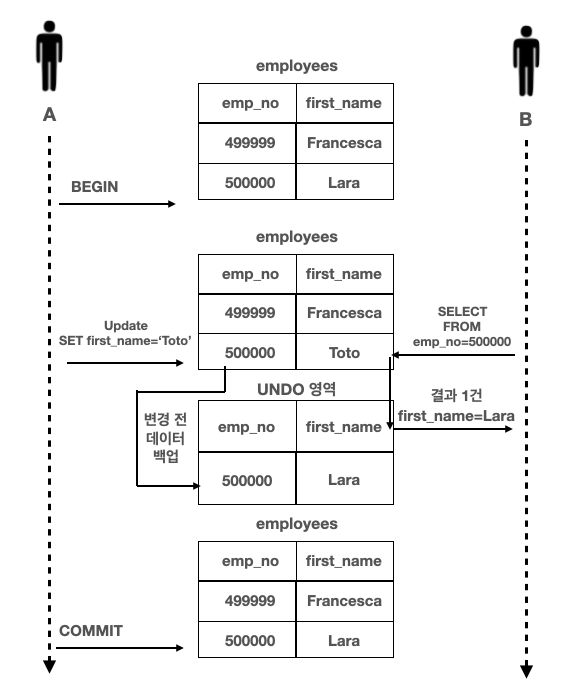 - A는 emp_no = 500000인 사원의 first_name을 "Lara"에서 "Toto"로 변경했는데 새로운 값인 "Toto"는 employee 테이블에 즉시 기록되고 기존값 "Lara"는 언두 영역으로 백업된다.