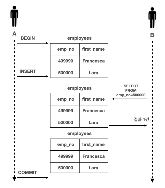 - B는 A가 INSERT한 사원의 정보를 커밋되지 않은 상태에서도 조회할 수 있다.