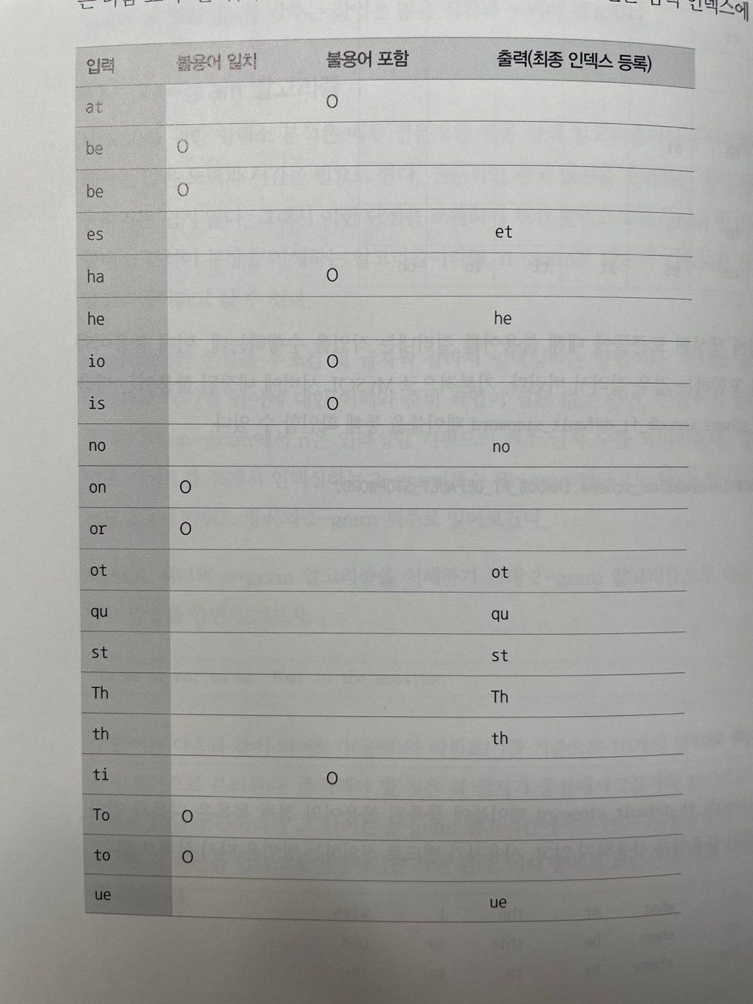 - n: 인덱싱할 키워드의 최소 글자 수, 일반적으로 2글자 단위로 키워드를 쪼개서 인덱싱하는 2-gram방식이 많이 이용된다.