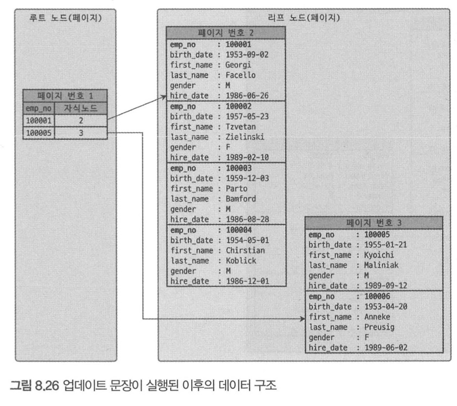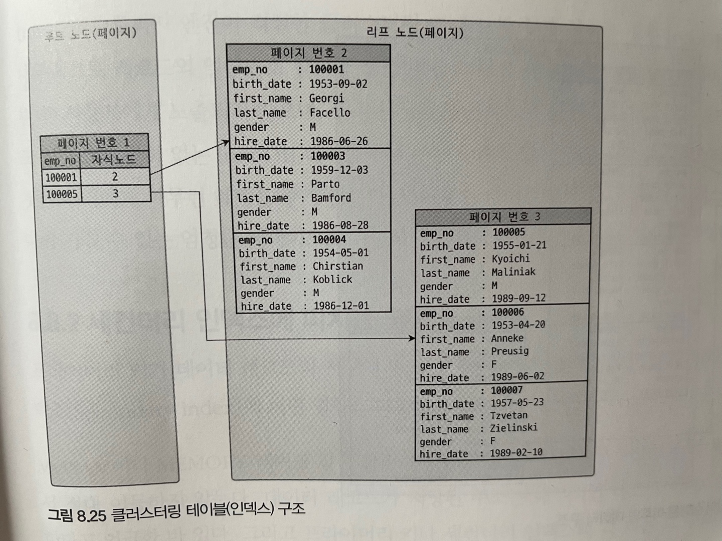 - 그림 8.25에서는 emp_no가 100007인 레코드는 3번 페이지에 저장돼 있다.