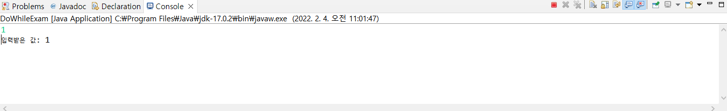Note) 콘솔에 10을 입력하면 10 출력하고 while문의 조건을 만족하므로 반복문 종료된다.