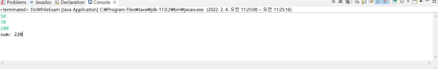 Note) 50, 70입력하고나서 100을 입력하면 종료되고 합인 220이 출력된다.