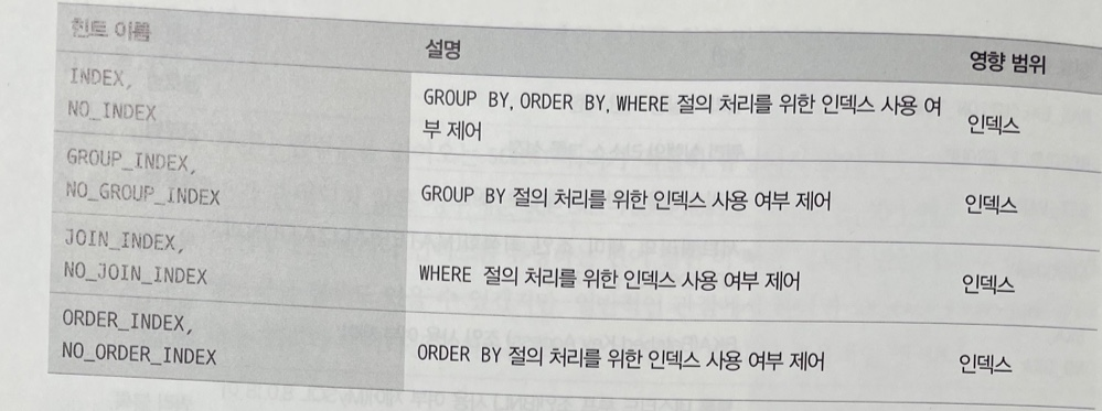 - 옵티마이저 힌트 ex) MySQL 5.6 부터 새롭게 추가되기 시작한 힌트들을 뜻한다. STRAIGHT_JOIN 도 포함한다.