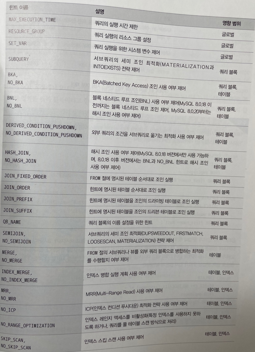 - JOIN_FIXED_ORDER: STRAIGHT_JOIN 힌트와 동일하게 FROM 절의 테이블 순서대로 조인을 실행하게 하는 힌트