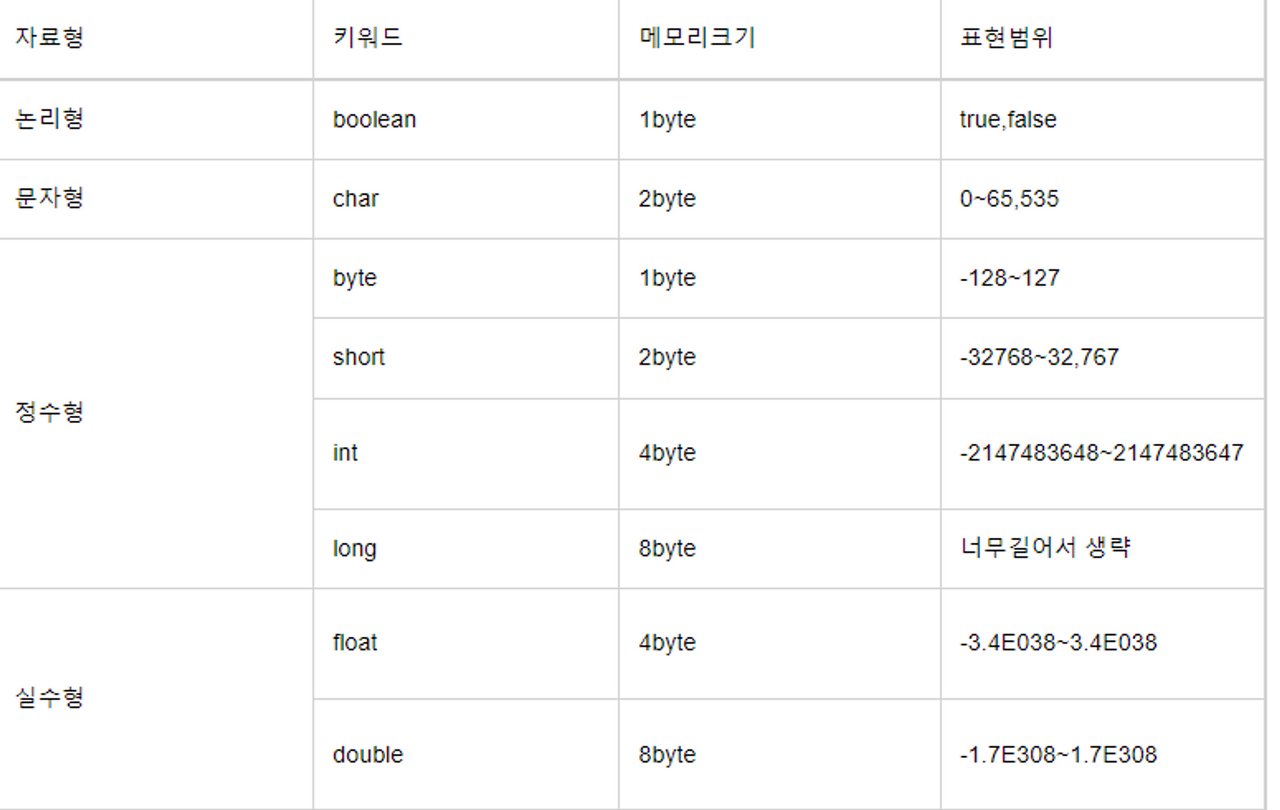 - 논리형: boolean(1byte)