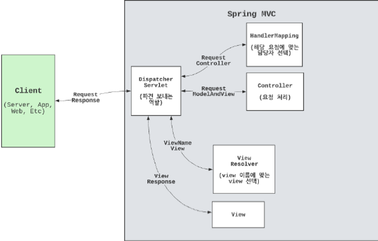- 클라이언트가 요청을 보내면 Dispatch servlet 가 요청을 받는다.