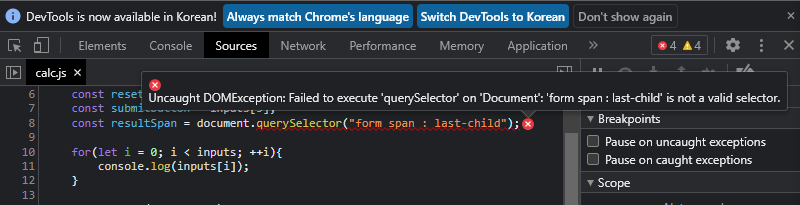 - Uncaught DOMException: Failed to execute 'querySelector' on 'Document': 'form span : last-child' is not a valid selector.
