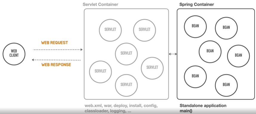 - 스프링 컨테이너는 서블릿 컨테이너 뒤에 존재하면서 Bean들을 관리한다.