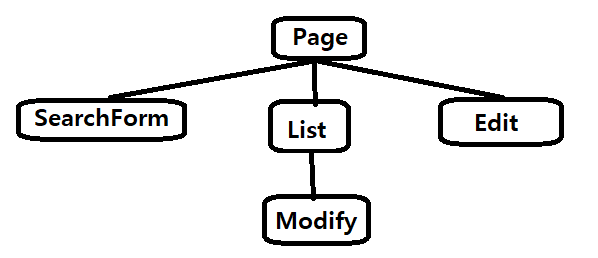 그림과 같이 최상위 컴포넌트(Page) 안에 검색 컴포넌트(SearchForm)와 목록 컴포넌트(List)가 있고 그 안에 또 자식 컴포넌트(Modify)가 있는 형태입니다.