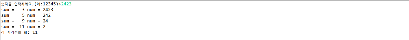 - 사용자로부터 숫자를 입력 받고 이 숫자의 각 자리의 합을 구하는 예제이다.