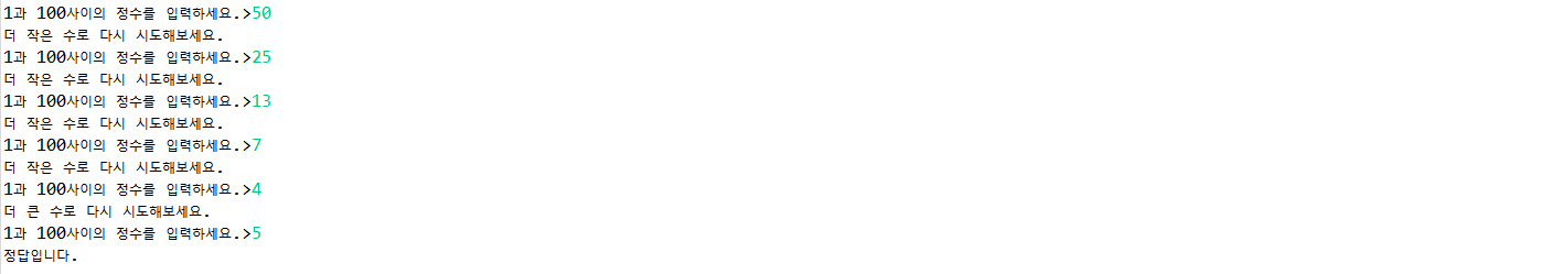 - 사용자가 입력한 input이 변수와 다른 동안 반복하다가 두 값이 같으면 반복문을 벗어난다.