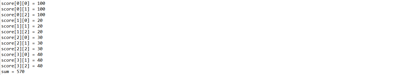 - 2차원 배열score의 모든 요소의 합을 구하고 출력하는 예제이다.