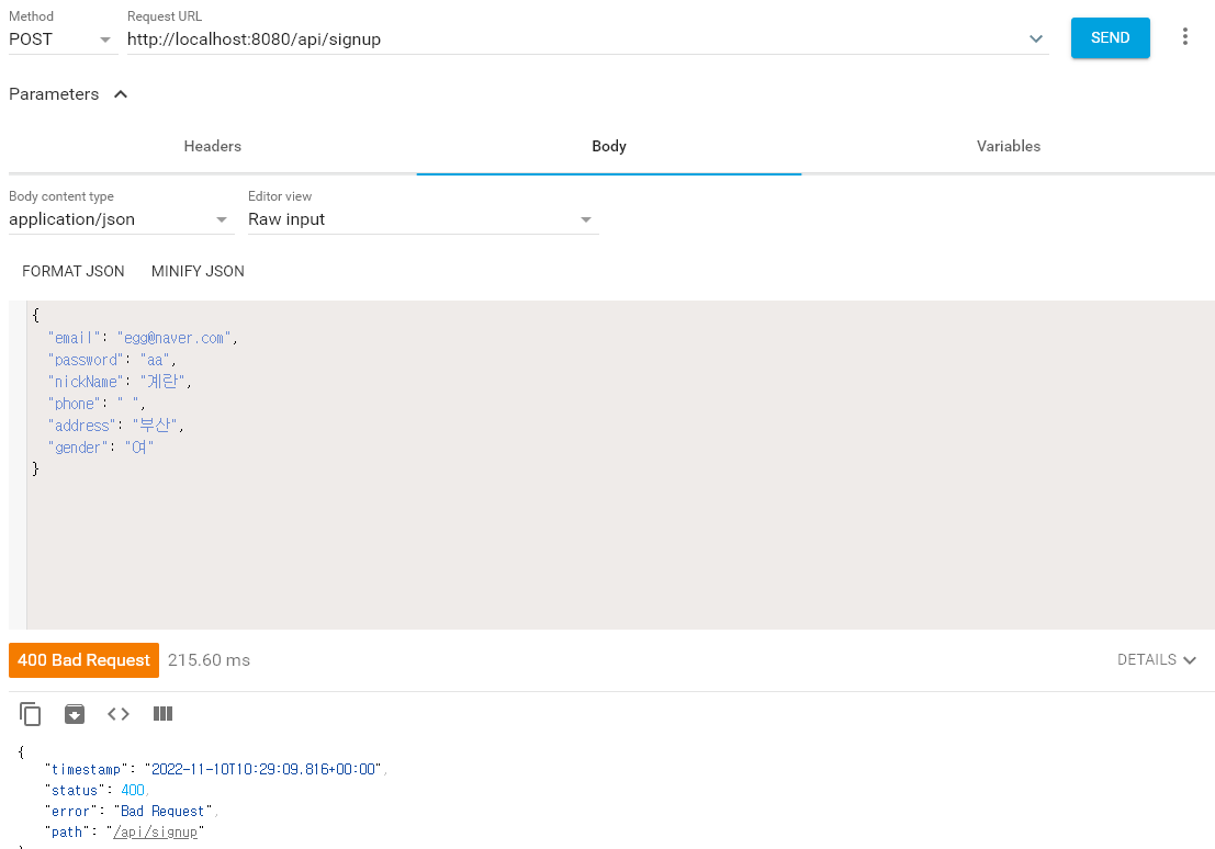 ExceptionHandler 만들기 서비스 로직을 들어가기 전에 회원이 정보가 유효하지 않을 때 예외를 터뜨린다. methodArgumentNotValidHandlerCustomException() MethodArgumentNotValidException를 처리해주는 핸들러가 있어야한다. 이를 만들어주지 않으면? 에러의 메시지가 다음과 같이 제대로 안 나온다. @Slf4j @RestControllerAdvice public class CustomExceptionHandler { @ExceptionHandler(MemberException.class) protected ResponseEntity memberHandlerCustomException( MemberException e) { MemberErro..