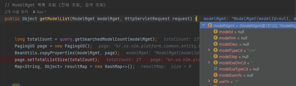 에러 해결 오류: 페이징 에러 원인: 메서드 실행 순서 오류 해결: 실행 순서를 바꾼다. cf) BeanUtils.copyProperties(A, B): 값이 같은 필드에 대해서만 A를 B에 복사한다. 문제 코드 페이징 인스턴스를 만들고 조건에 맞는 데이터가 몇 개인지 카운트한다. 결과값을 page에 세팅한 다음 model 정보를 paging 인스턴스에 카피해준다. 그런데, 이렇게 하고나서 검색 조회를 하면 페이지 개수가 totalPage 개수로 설정이 되서 조회하는 데이터를 보여줄 페이지가 2개인 경우에도 페이지가 (전체 목록를 보여줄 수 있는) 4까지 조회된다. (3, 4를 누르면 데이터가 없다고 나오기는 한다. ) 문제점: paging 인스턴스와 model 인스턴스 간에 searchedModelCo..