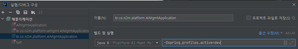 Spring VM 옵션 설정 방법 - IntelliJ, VS code 차이점 사내에서 vs code, eclipse를 쓰는 분들도 있고 IntelliJ 를 쓰기도 한다. vs code 에서는 빌드 관련한 설정을 위해서 .json 형태의 파일을 쓴다. ("-Dkey=value" 와 같은 데이터가 담겨 있다. ) 그런데, 이를 intelliJ에 적용하려면 어떻게 해야할까? 먼저, yml 파일에 개발 버전, 배포 버전에 대한 설정 값을 다르게 설정한다. spring: config: activate: on-profile: - local # 로컬로 실행할 경우, 설정 정보 ex) DataBase 정보 등 spring: config: activate: on-profile: - dev # 배포할 경우, 설정 정보 다..